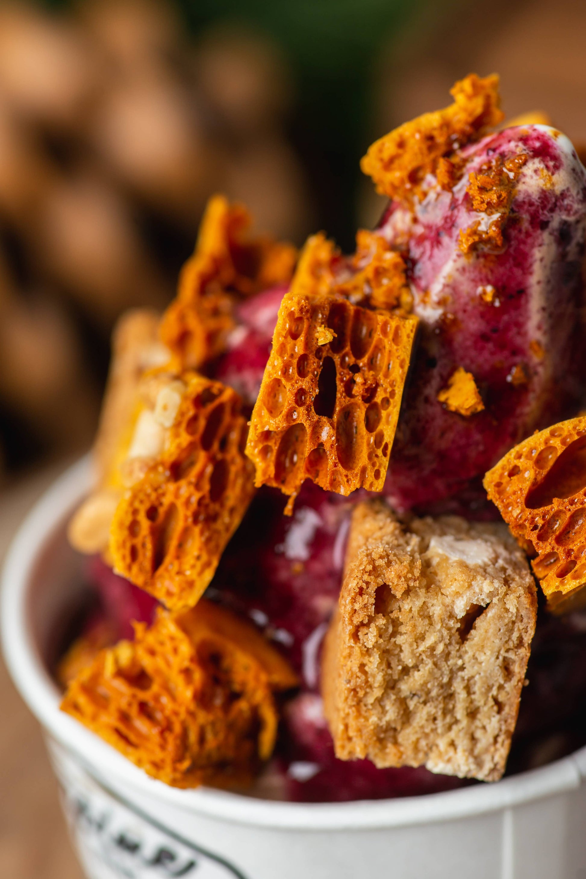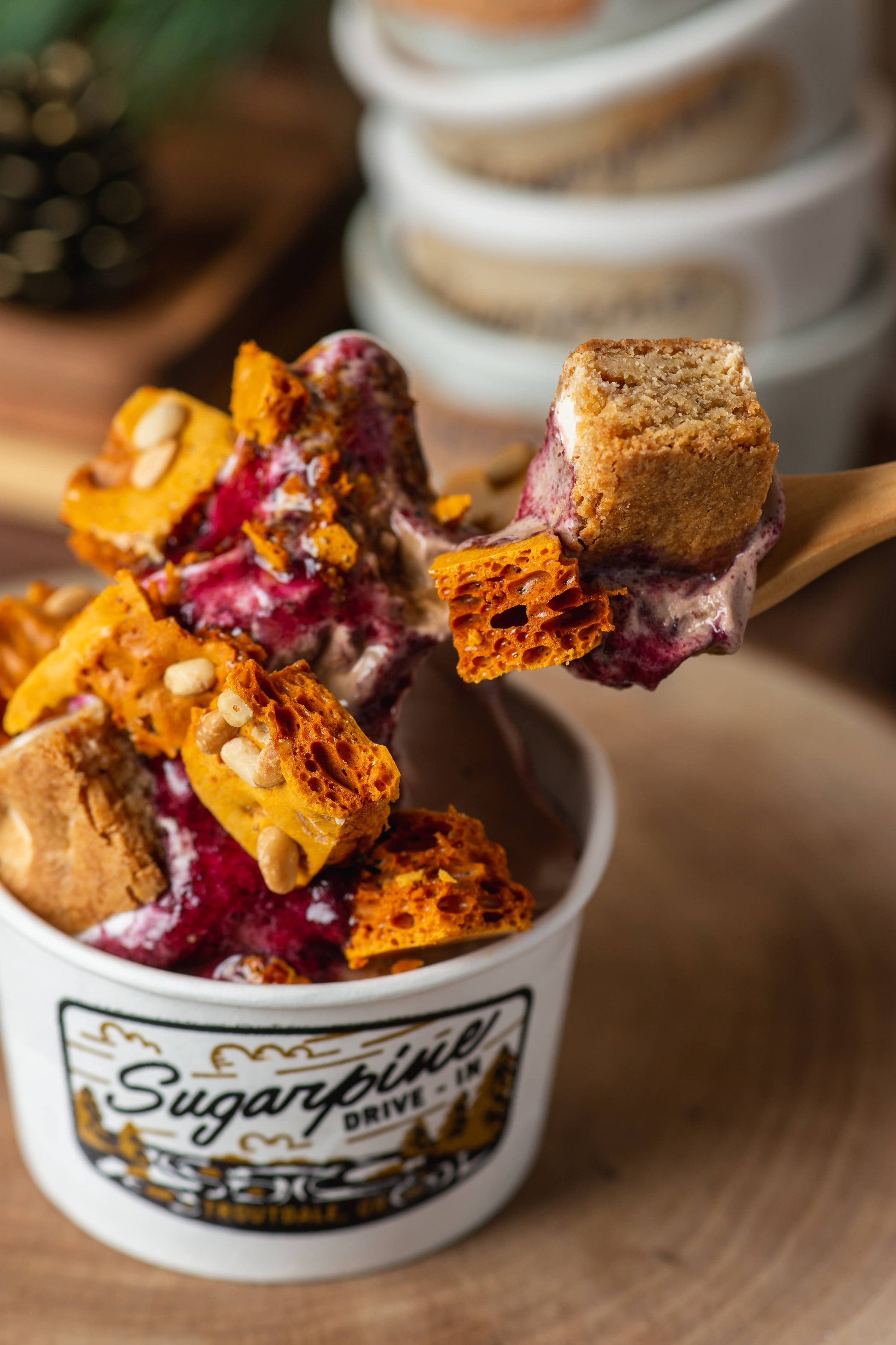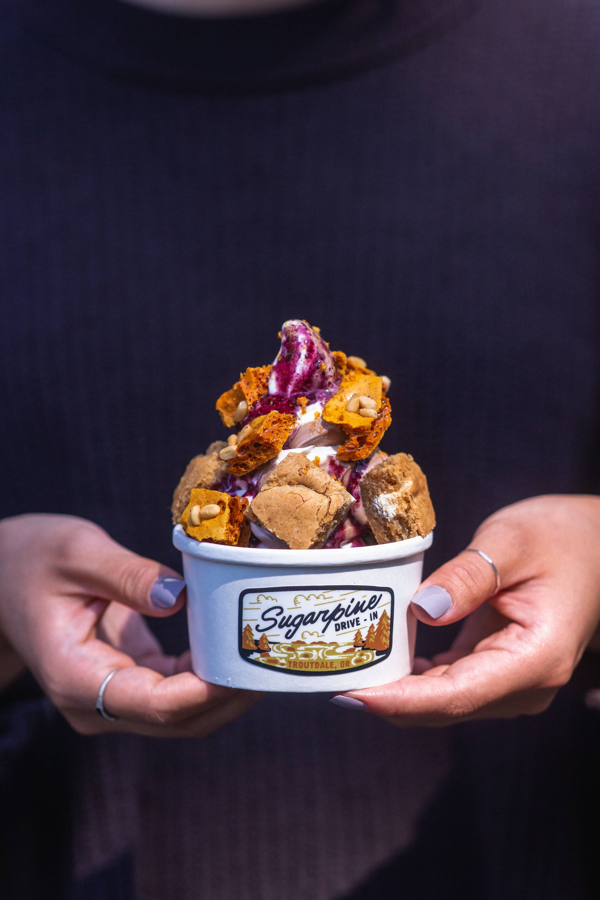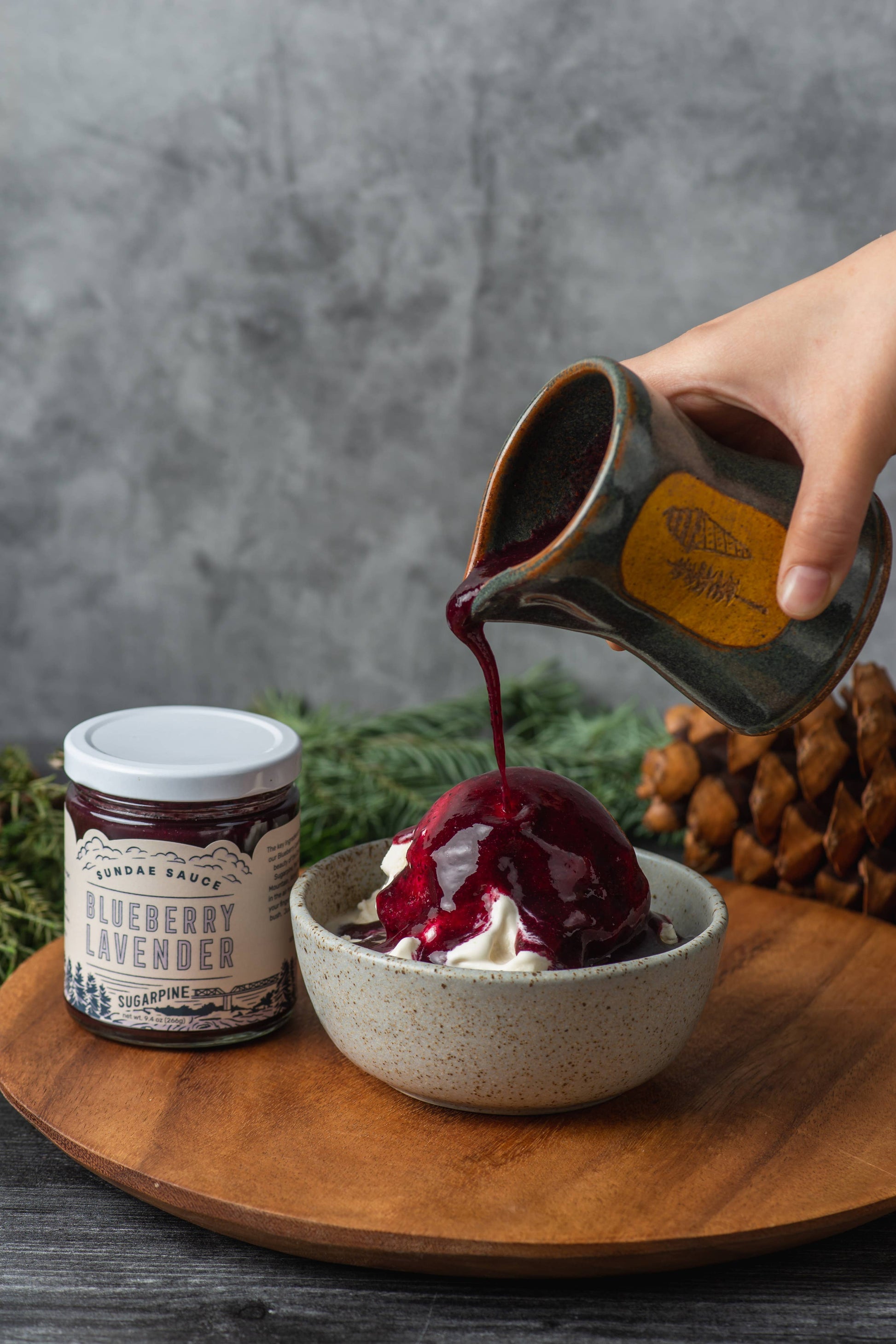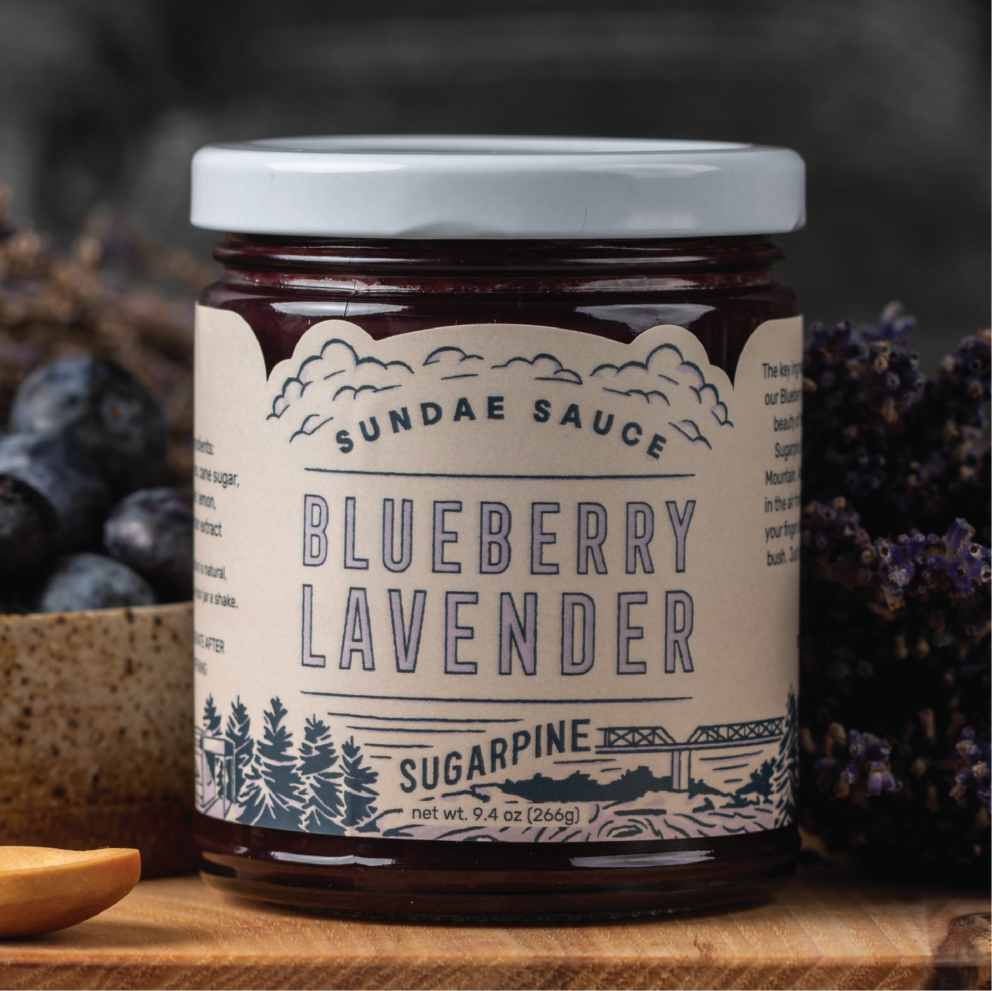 The key ingredient in the Sugarpine Drive-In's signature Larch Mountain Sundae, the Blueberry Lavender Sauce was inspired by the natural beauty of the Columbia River Gorge. Driving east from Sugarpine Drive-In, the Historic Columbia River Highway will lead you to Larch Mountain. Along the way, you cannot miss the floral scent of lavender fields or resist the urge to turn your fingers blue picking blueberries straight from the bush. Just call it a love letter from them to the West Gorge.
