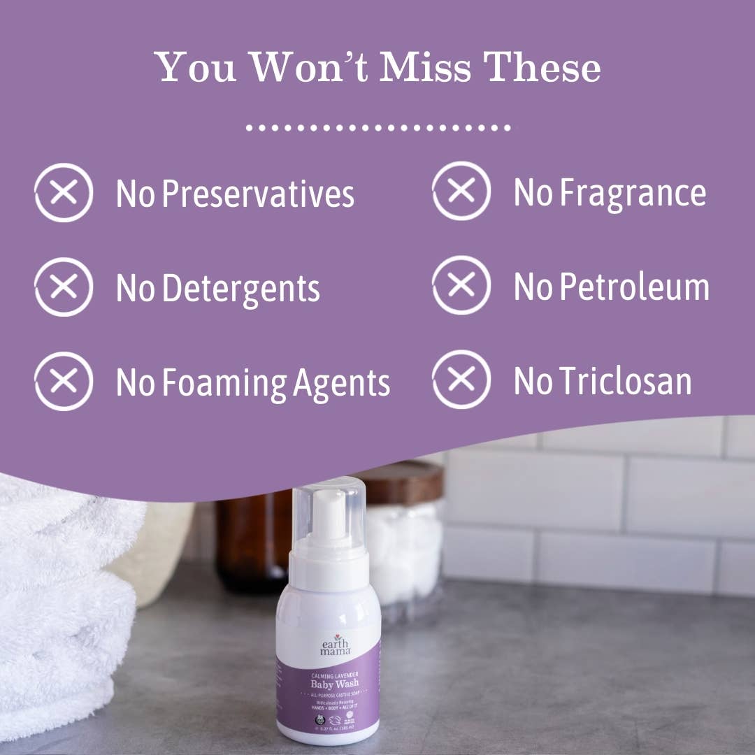 Calming Lavender Baby Wash is a castile-based lavender vanilla soap made with organic herbs and oils for a soothing, calming bedtime or anytime. And it’s not just for babies! Use it safely for the whole family, including pregnant and breastfeeding mamas, as well as around your house as a non-toxic hand wash and an essential ingredient for multiple DIY household cleaners.
