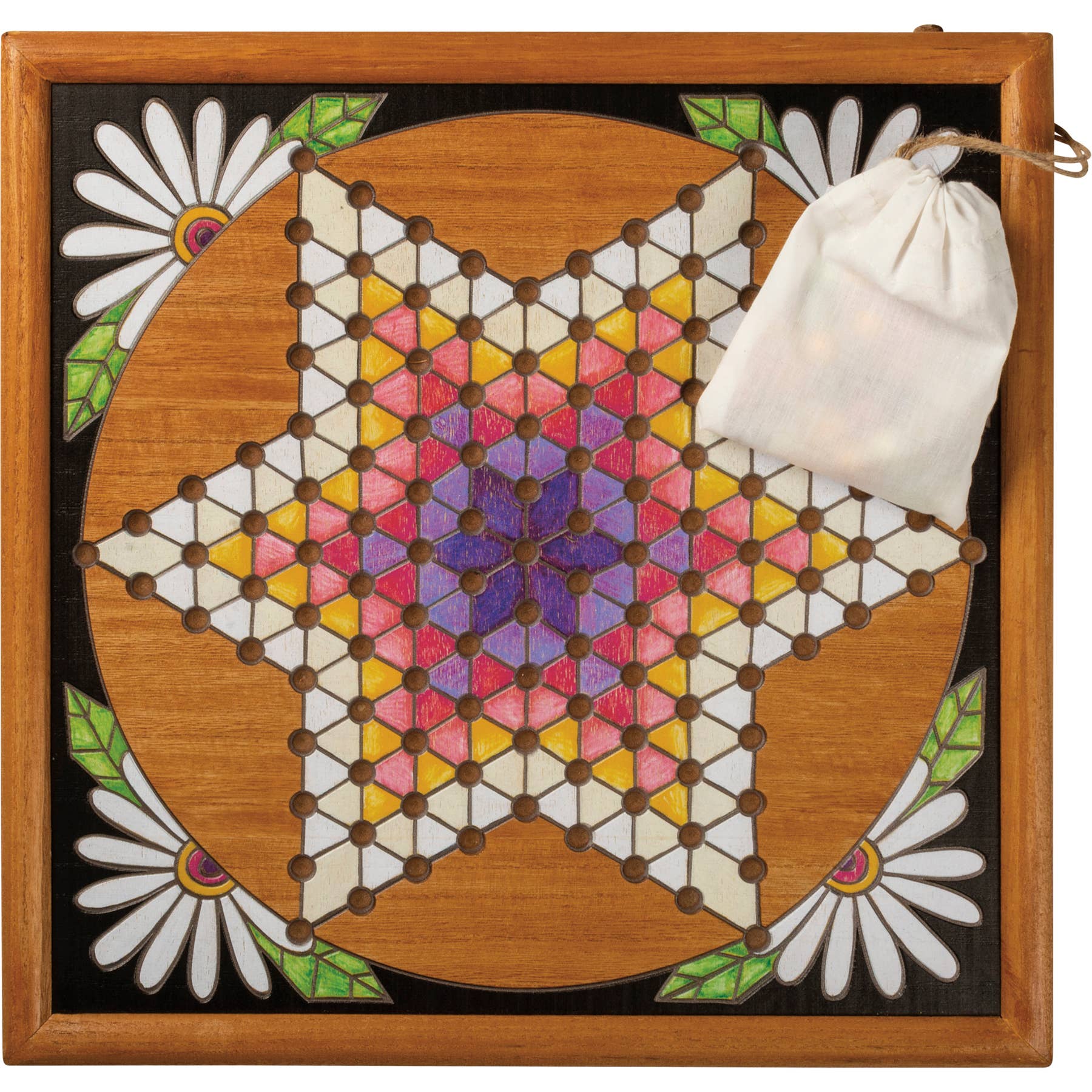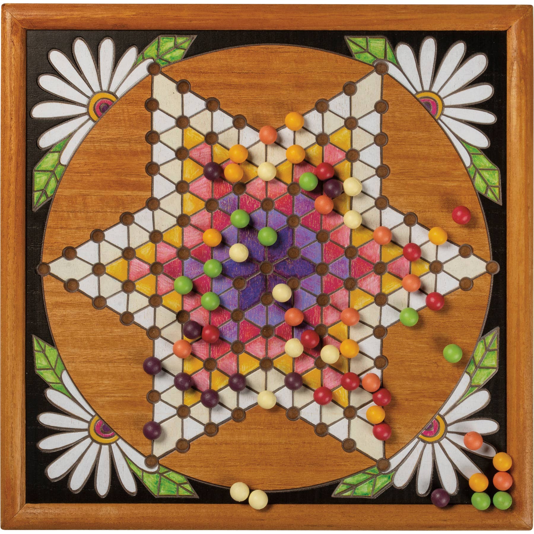 A wooden Chinese Checkers game featuring intricate, vibrantly colored wood burned designs.