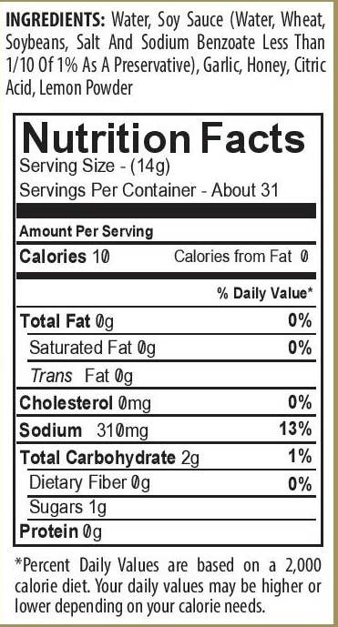 This marinade contains a soy sauce base with honey, garlic and spices.