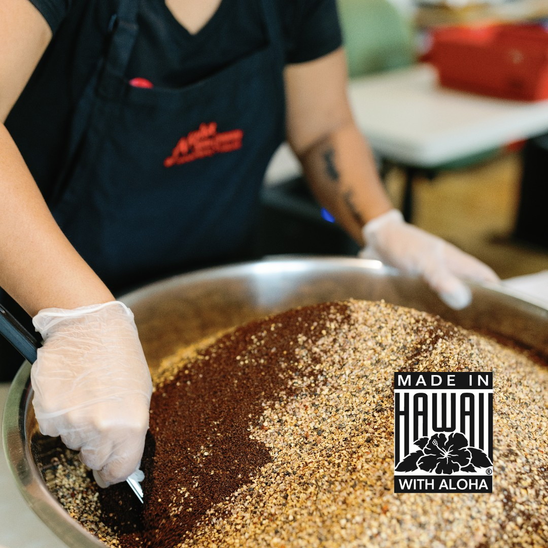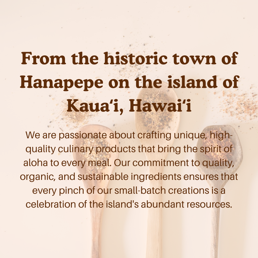 Ingredients:100% Kaua'i Grown Coffee, Hawaiian Sea Salt (Sea Salt & 'Alaea Hawaiian Red Clay), Sea Salt, Organic Evaporated Cane Juice, Organic Dehydrated Vegetables (Onion, Tomato, Garlic, Celery), Organic Spices (incl. Paprika for color), Natural Smoke Flavor.