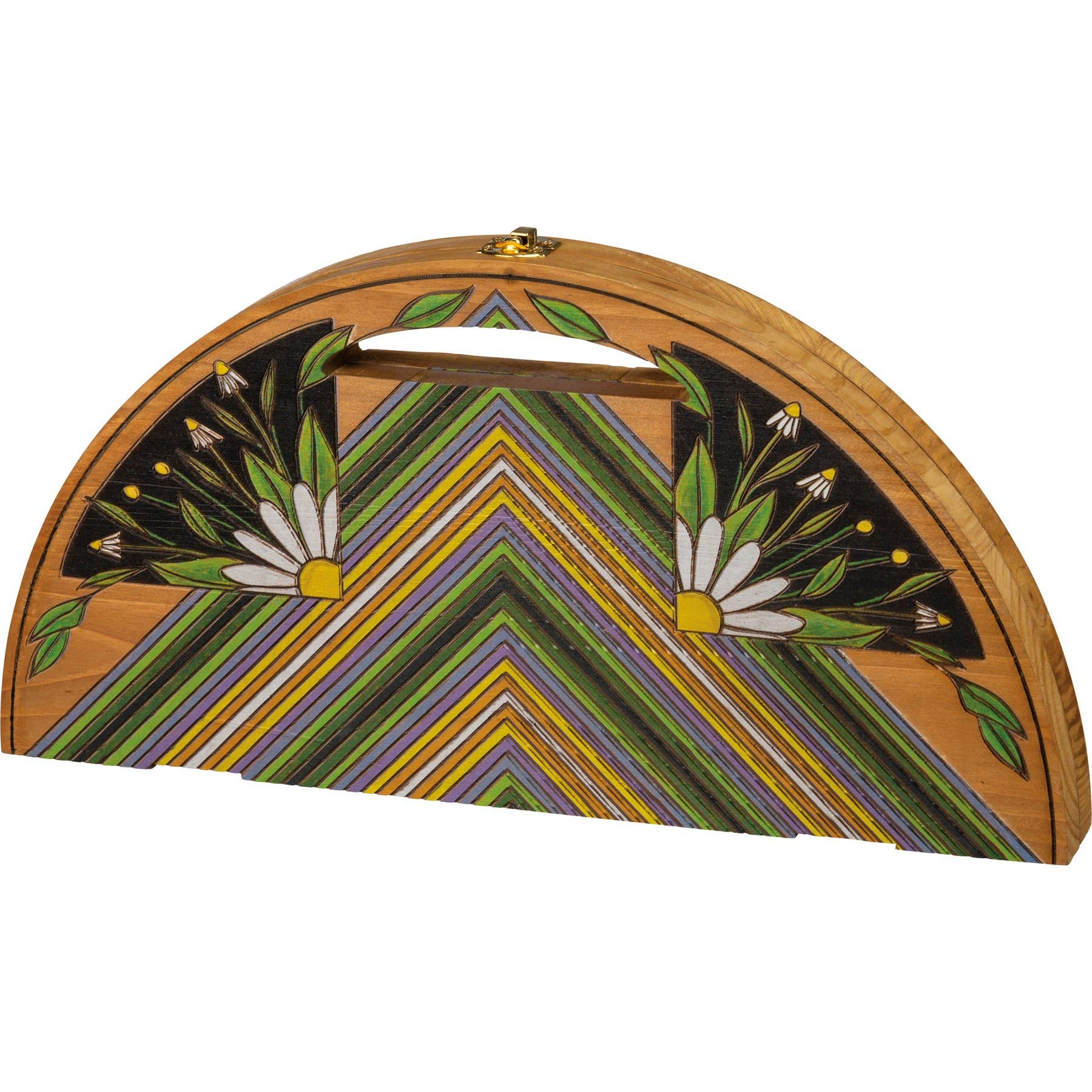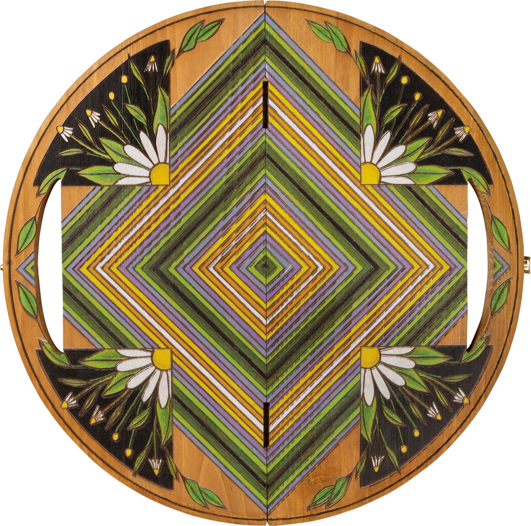 A wooden travel Mancala board game from our Toys & Games Collection featuring intricate, vibrantly colored wood burned designs.