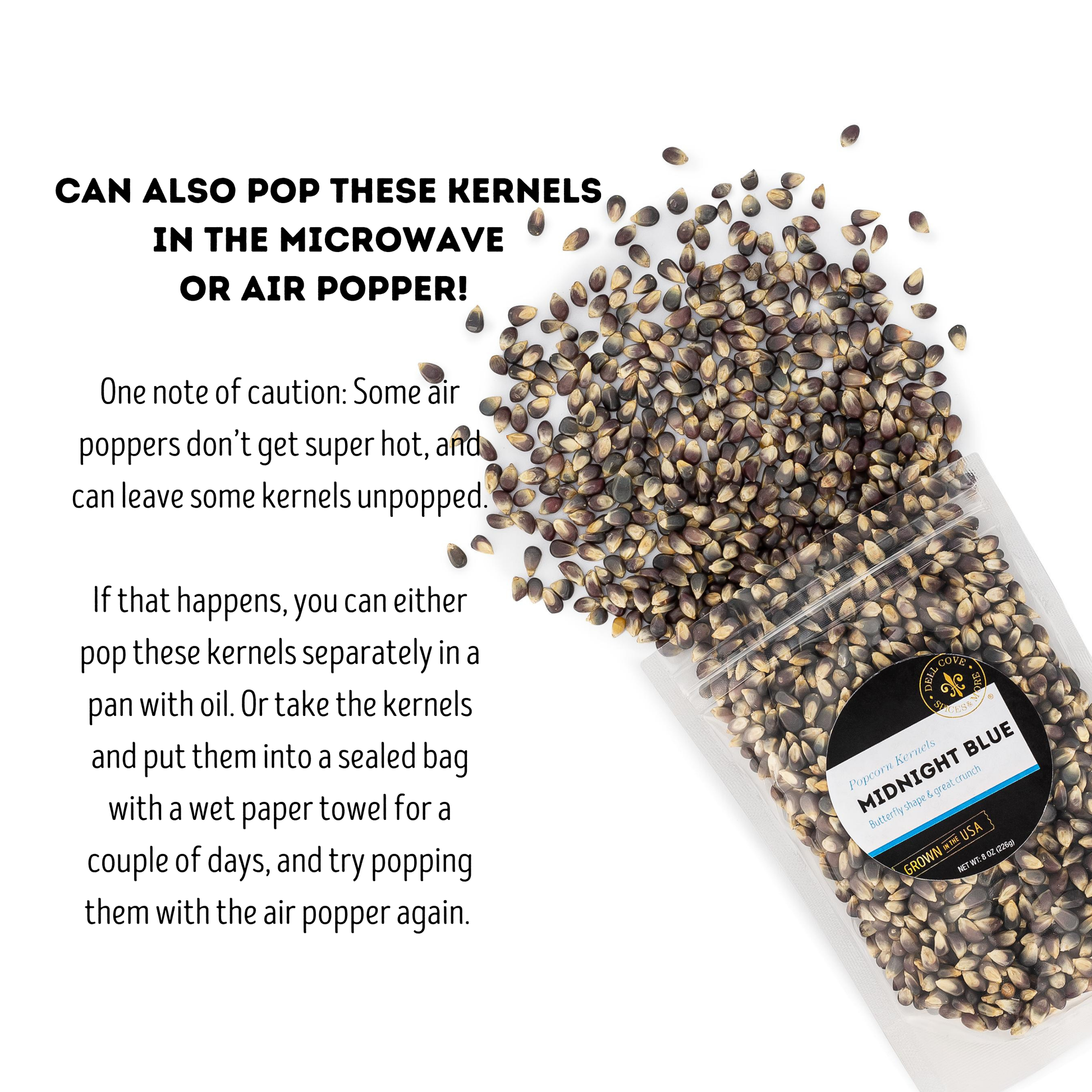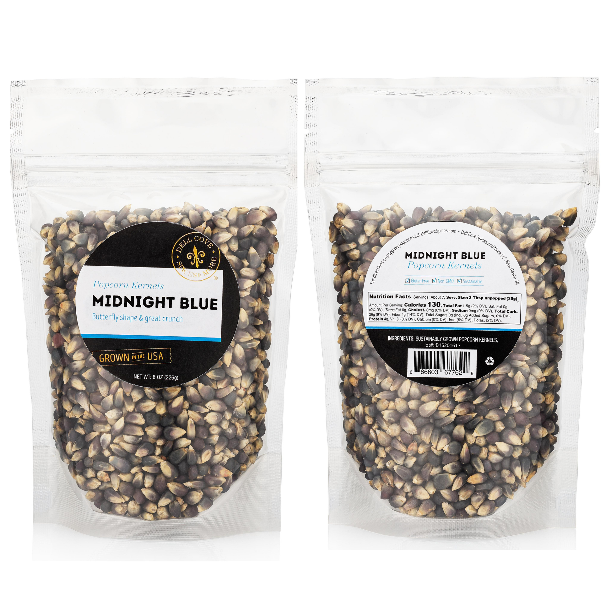 A must for popcorn fans, Dell Cove® Midnight Blue butterfly popcorn kernels are hull-less and slightly sweet, and make a popped corn with a nice crunchy texture. Pops white with a dark center.