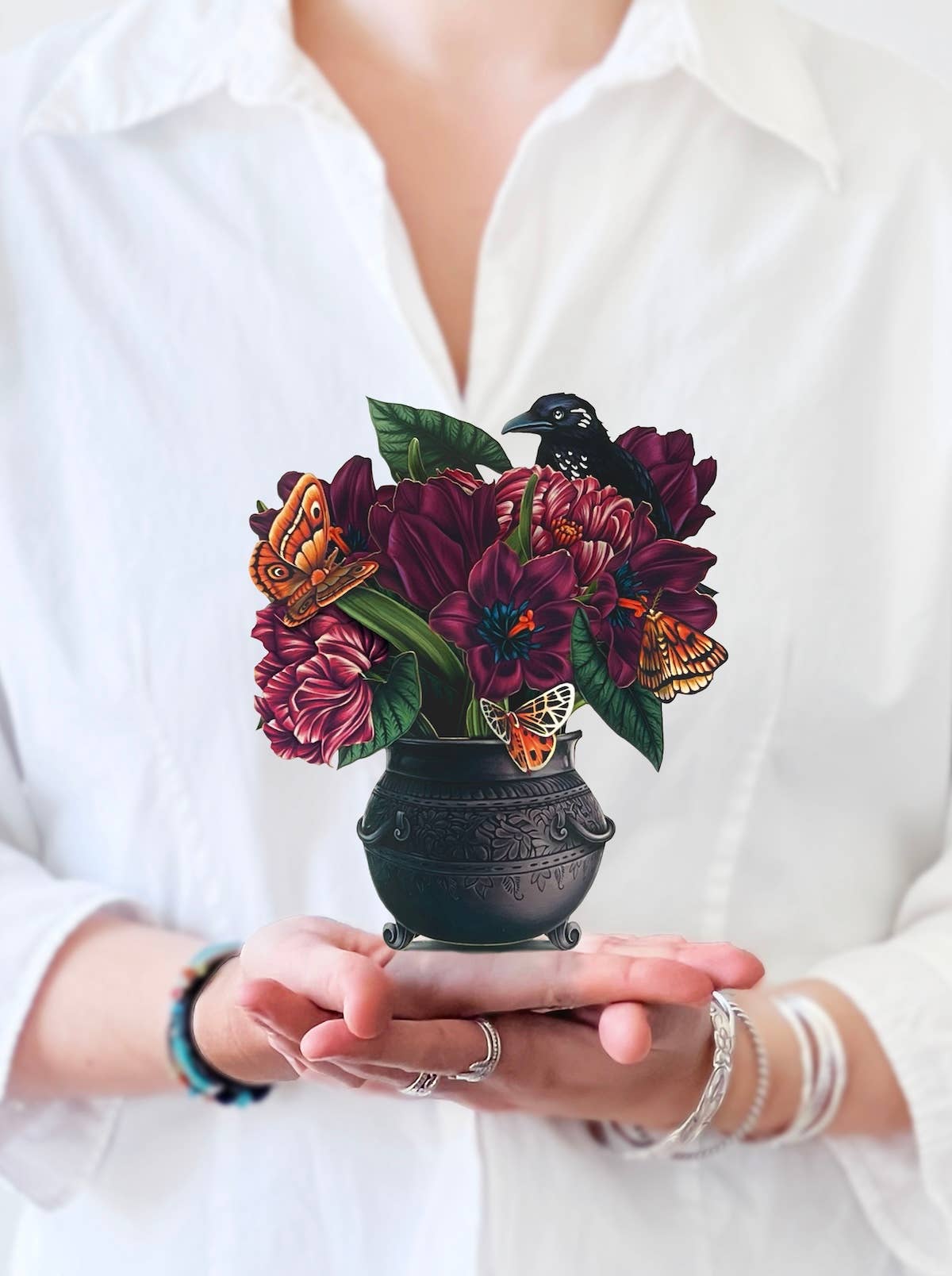 A mini bouquet of tulips and begonia leaves dazzles with velvety hues of deep purple and merlot in a witch’s cauldron. Fitted with a mysterious raven and flutter of tiger moths, the witching hour lasts all year long with the Moonlight Garden Bouquet.