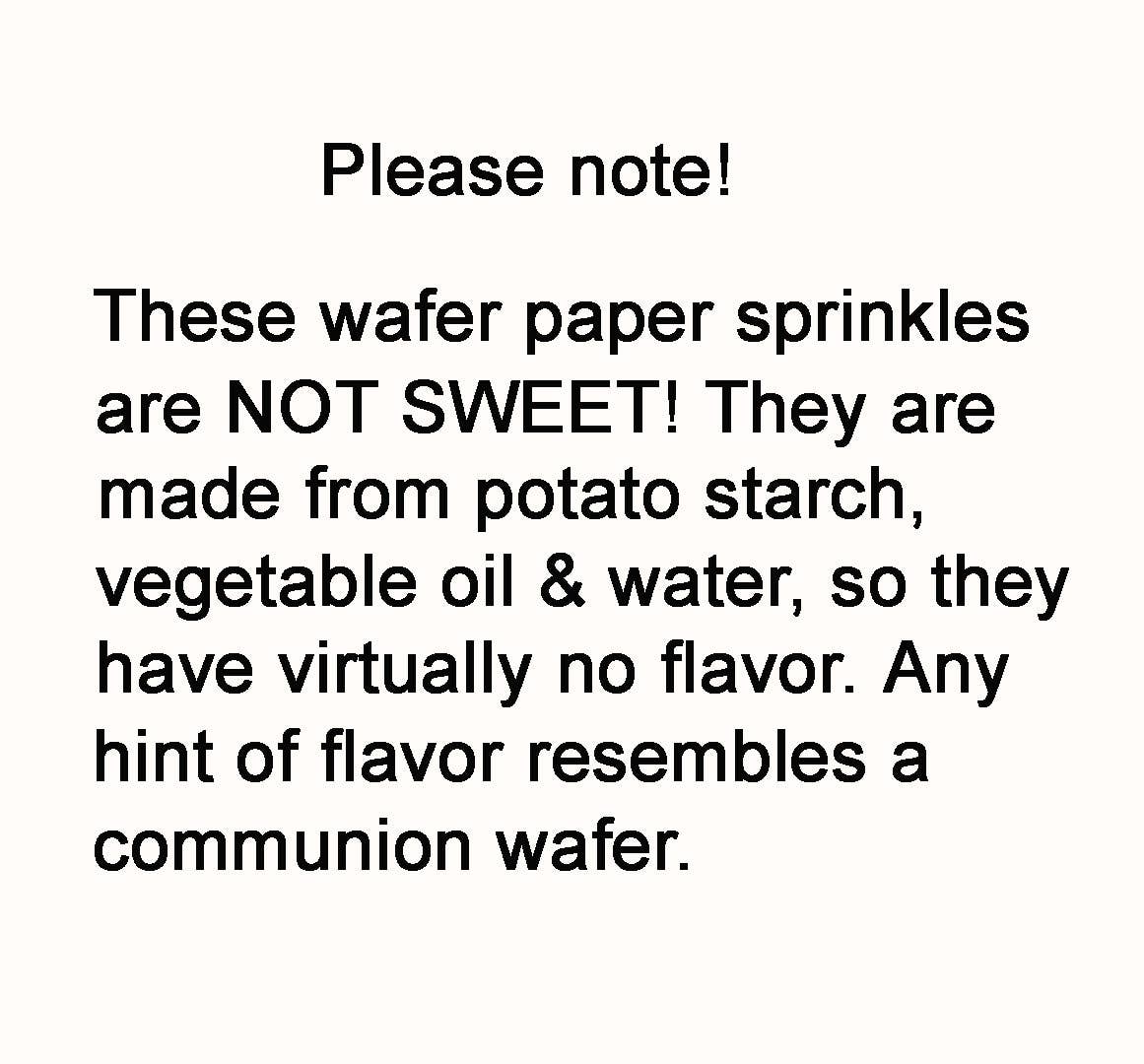 * PLEASE NOTE! These wafer paper sprinkles are NOT SWEET! They are made from potato starch, vegetable oil and water, so they have virtually no flavor. Any hint of flavor tastes a bit like communion wafers. They will NOT alter the flavor of your cupcakes, cakes or drinks!