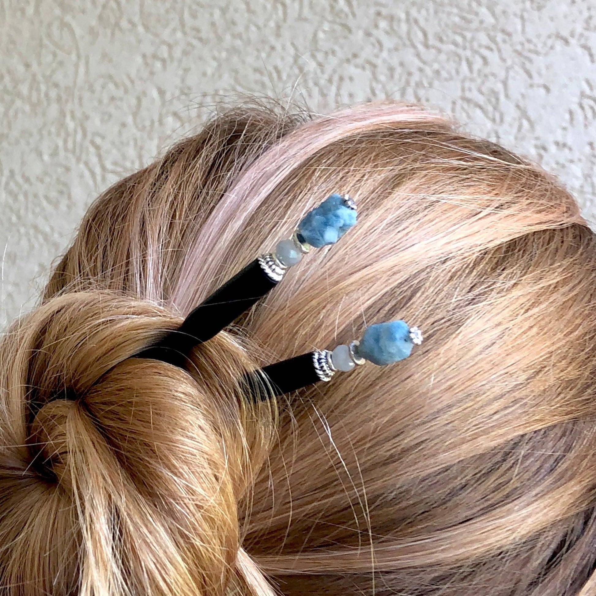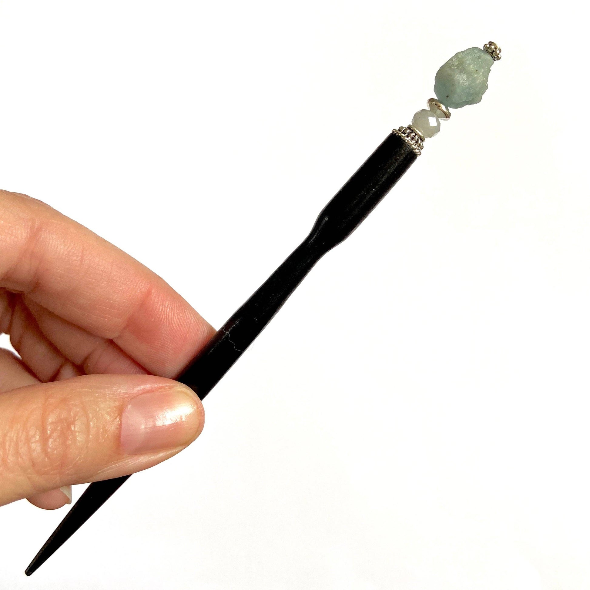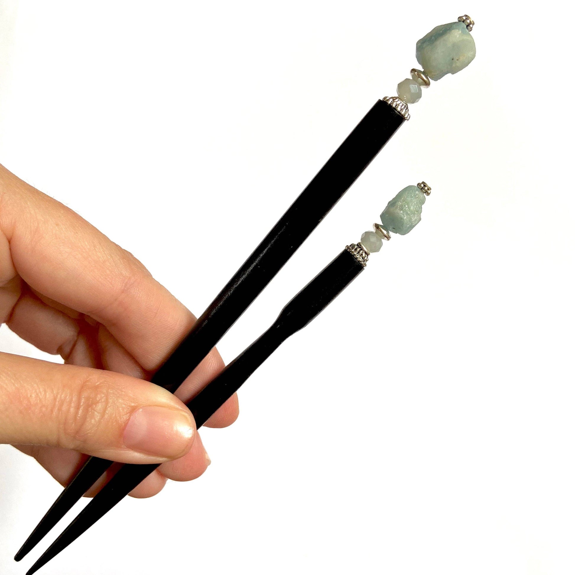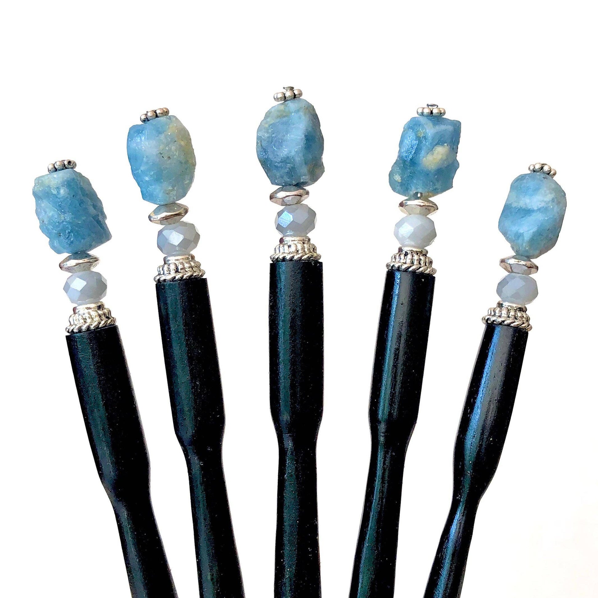The serene blue rough cut of the natural raw Aquamarine stone gives it a bohemian flair. Tidal Hair Sticks is bringing back the 90's FRIENDS-style bun trend! Price is for a single Tidal Hair Stick. The standard base is a 4 1/2 inch black lacquered wood with a unique tapered shape, but after beads are added, the Hair Stick is around 5 1/2 to 6 inches total.