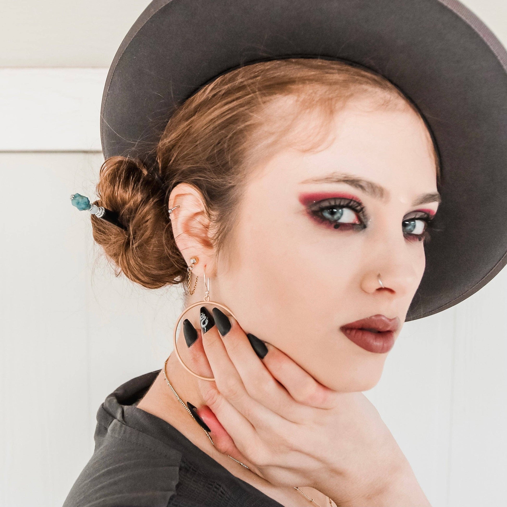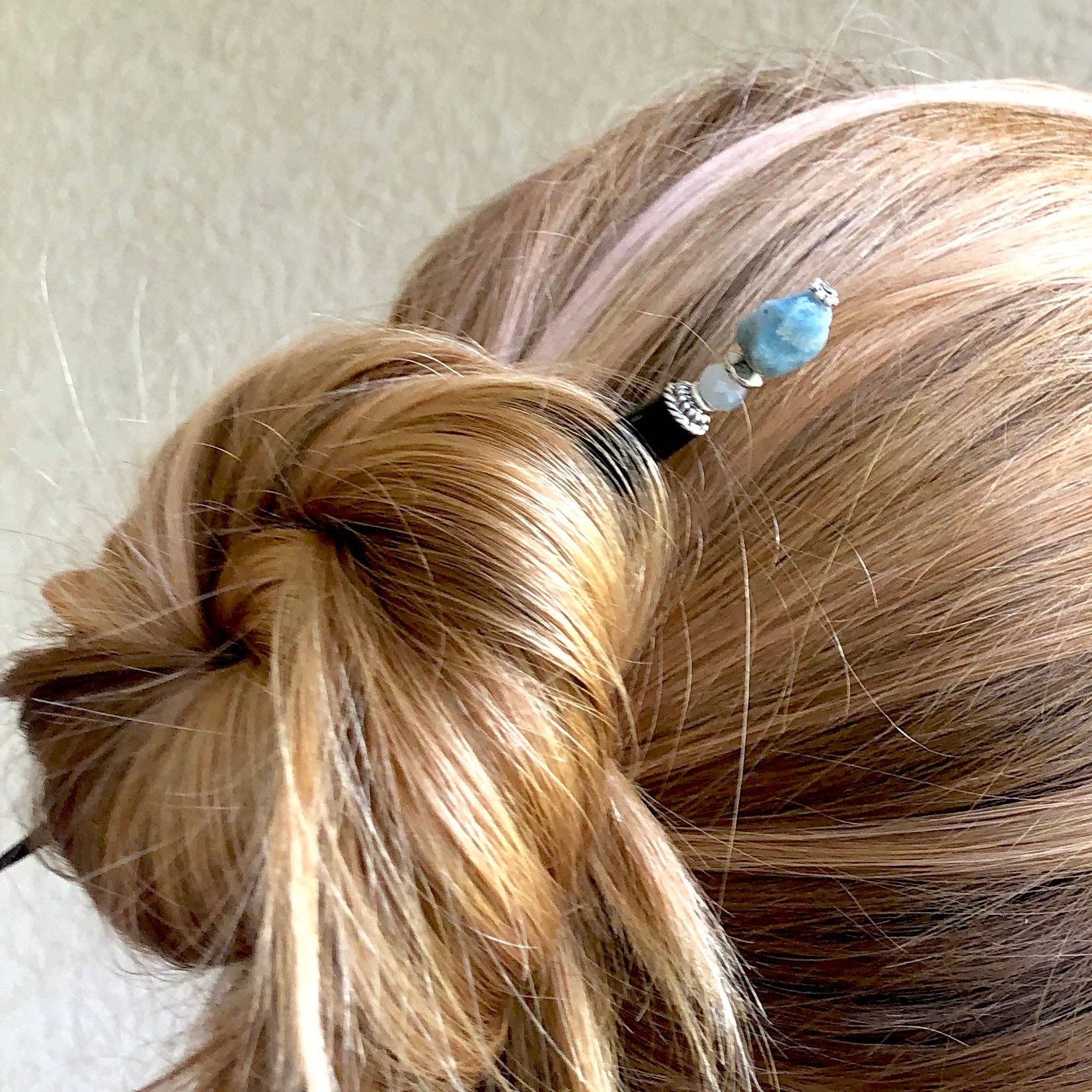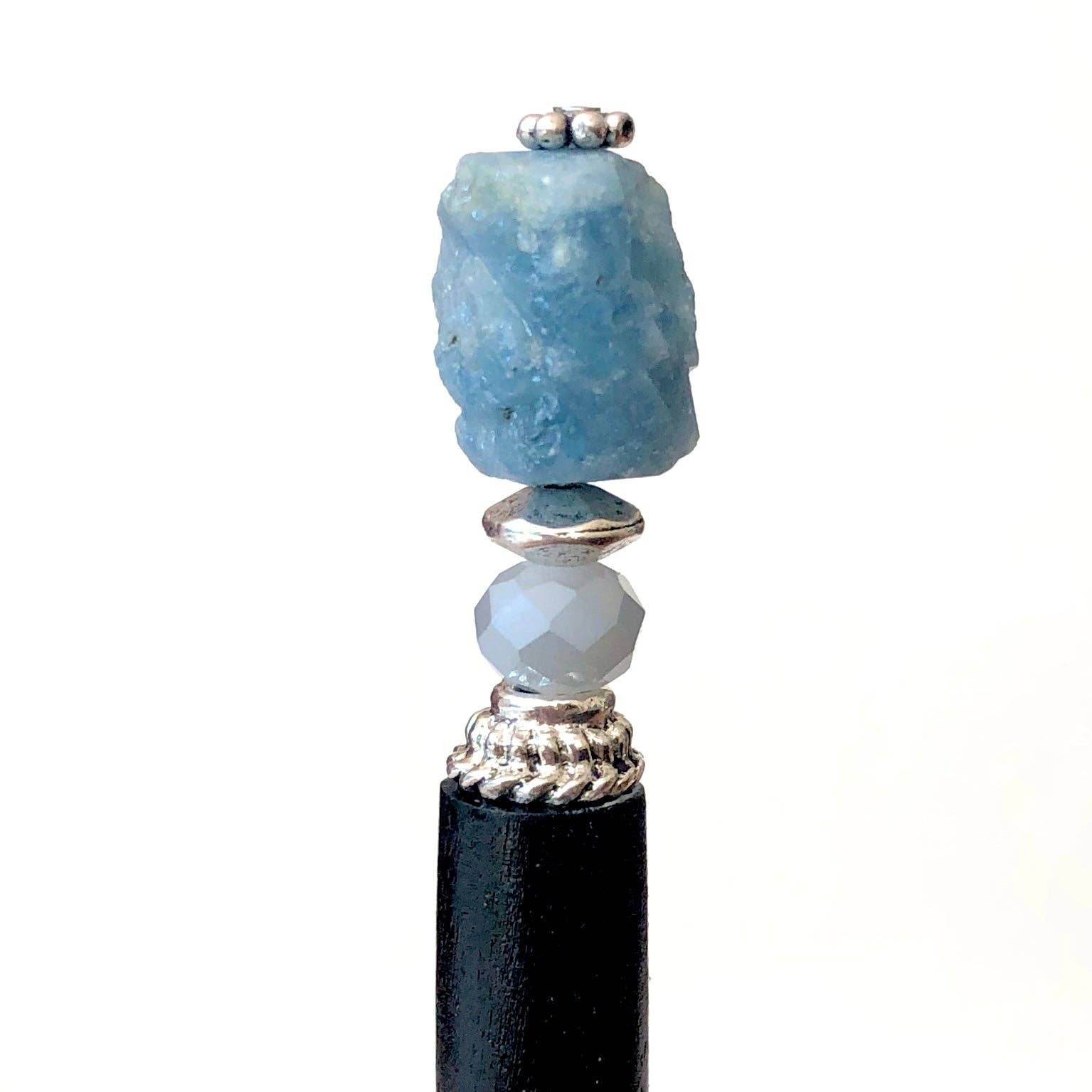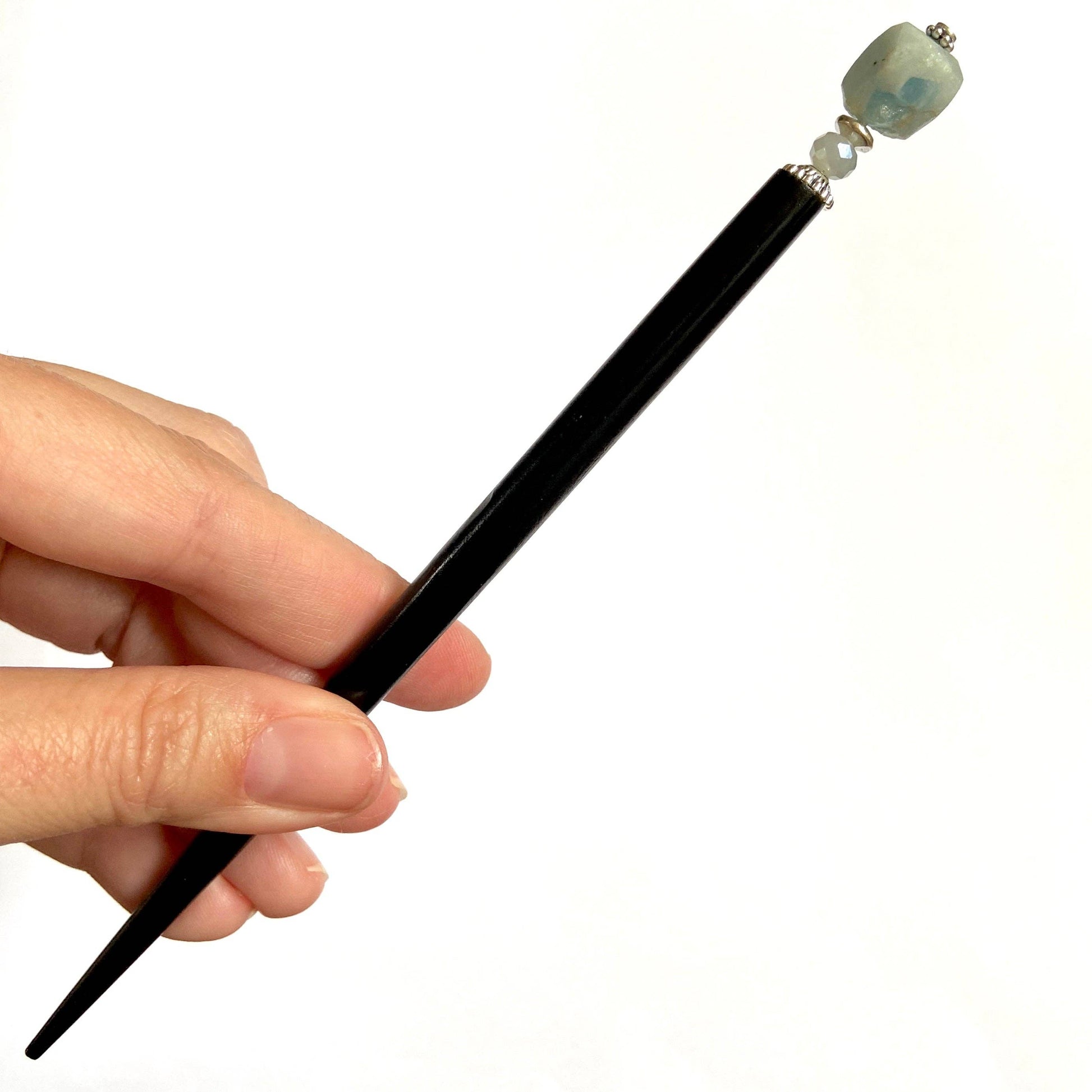 The serene blue rough cut of the natural raw Aquamarine stone gives it a bohemian flair. Tidal Hair Sticks is bringing back the 90's FRIENDS-style bun trend! Price is for a single Tidal Hair Stick. The standard base is a 4 1/2 inch black lacquered wood with a unique tapered shape, but after beads are added, the Hair Stick is around 5 1/2 to 6 inches total.