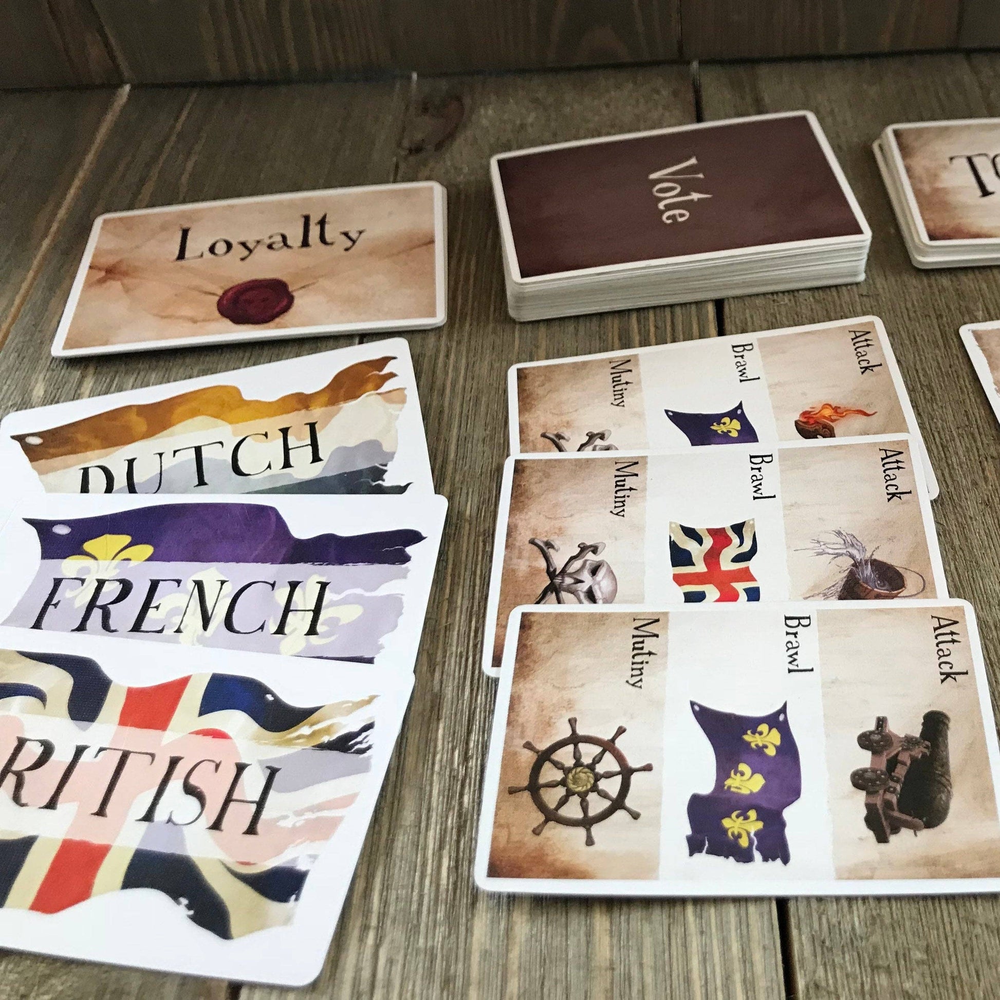 Each player holds a secret loyalty to the British or French and is trying to have the most treasure in their team's holds before the Spanish Armada arrives.
